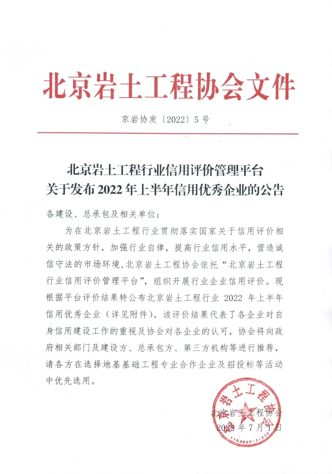北京巖土工程行業(yè)2022上半年信用優(yōu)秀企業(yè)